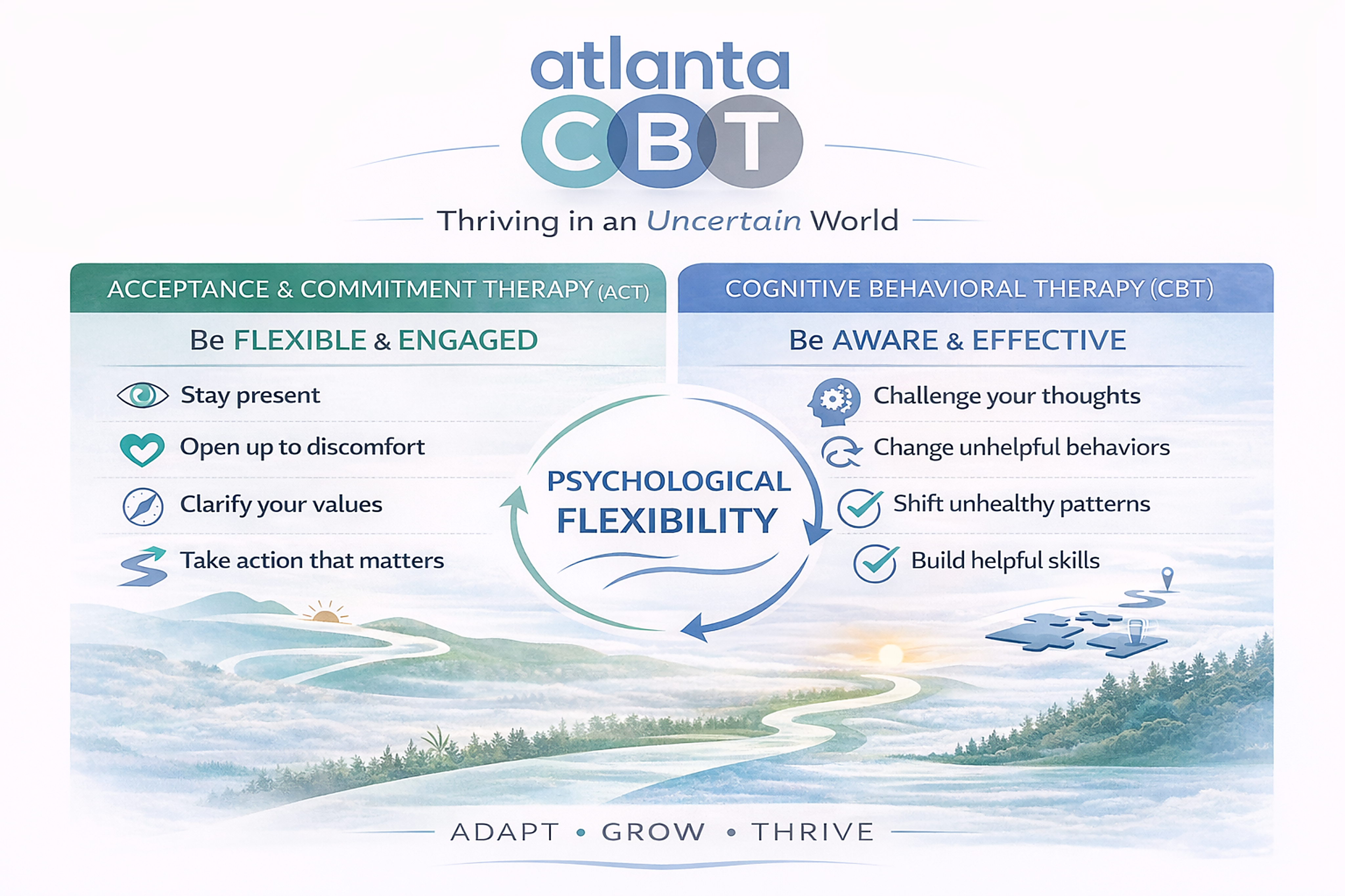 CBT is sometimes described as rigid. That is not how we practice. We integrate CBT and ACT to build psychological flexibility — the ability to respond skillfully to difficult thoughts and emotions while taking meaningful, values-based action in the face of uncertainty.